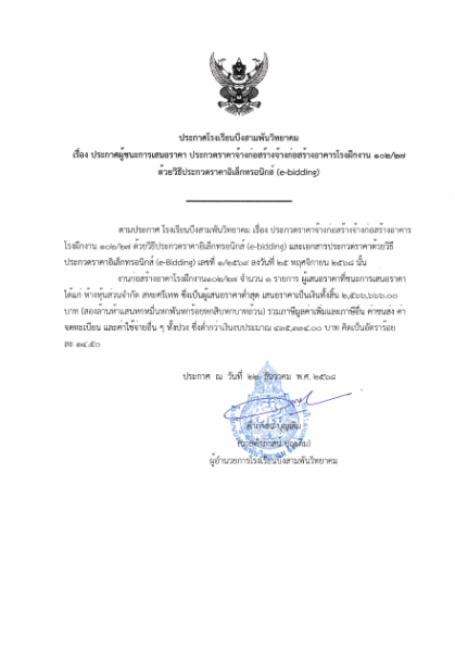 ตามประกาศโรงเรียนบึงสามพันวิทยาคม เรื่อง ประกวดราคาจ้างก่อสร้างอาคารโรงฝึกงาน ๑๐๒/๒๗ ด้วยวิธีประกวดราคาอิเล็กทรอนิกส์ (e-Bidding) และเอกสารประกวดราคาด้วยวิธี
