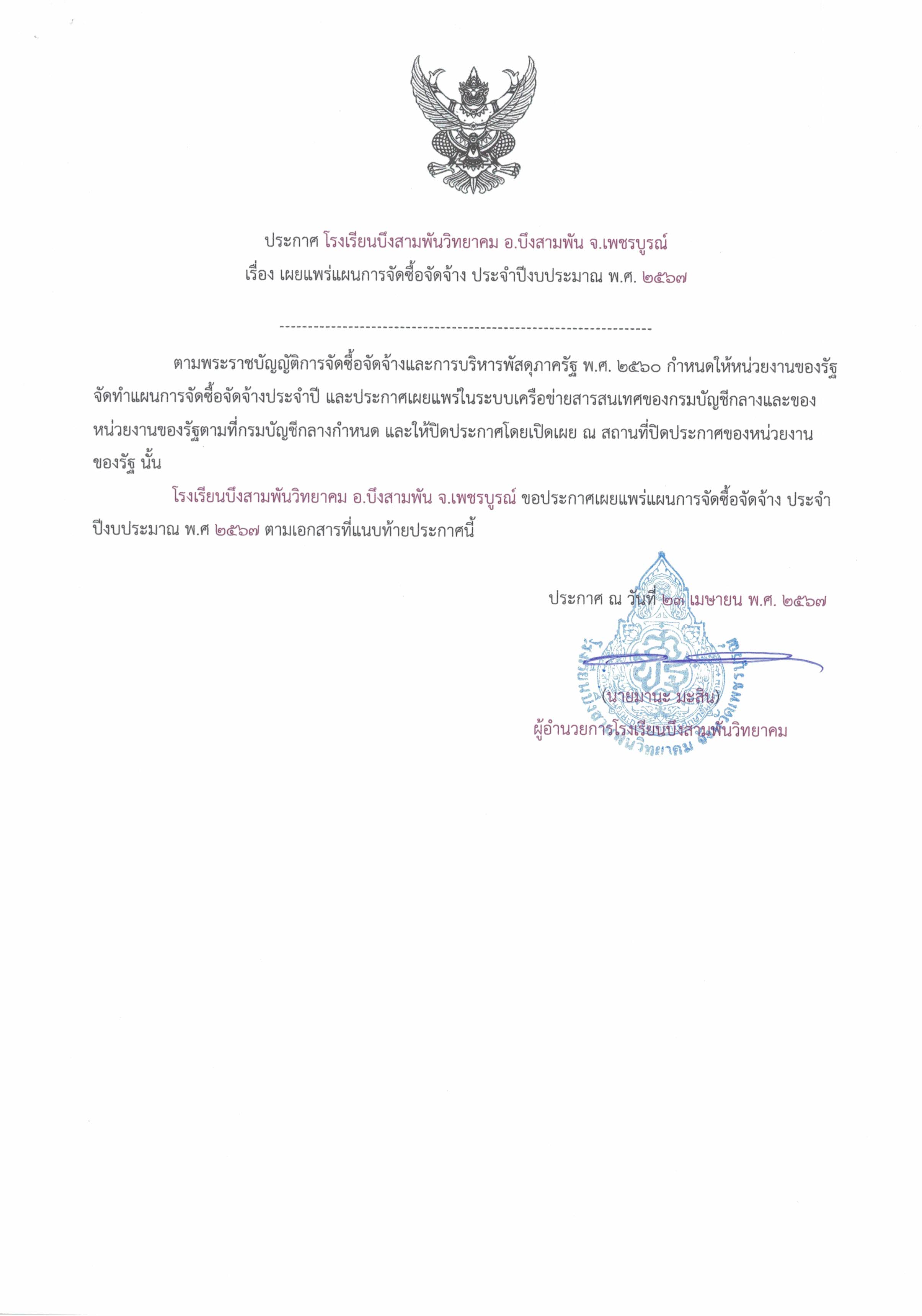 โรงเรียนบึงสามพันวิทยาคม อ.บึงสามพัน จ.เพชรบูรณ์ ขอประกาศเผยแพร่แผนการจัดซื้อจัดจ้าง ประจำปีงบประมาณ พ.ศ ๒๕๖๗ ตามเอกสารที่แนบท้ายประกาศนี้