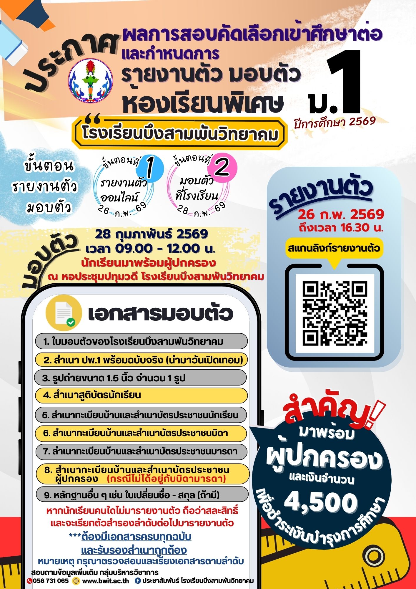 ประกาศโรงเรียนบึงสามพันวิทยาคม เรื่อง ประกาศผลการสอบคัดเลือกเข้าศึกษาต่อชั้น ม. 1 ประเภทห้องเรียนพิเศษ ปีการศึกษา 2569 จึงขอให้นักเรียนที่ได้รับการคัดเลือก ลำดับที่ 1-30 นำเอกสารและหลักฐานพร้อมเงินบำรุงการศึกษา มารายงานตัวในวันเสาร์ที่ 28 กุมภาพันธ์ พ.ศ. 2569 เวลา 09.00-12.00 น. ณ ห้องประชุมปทุมวดี โรงเรียนบึงสามพันวิทยาคม หากนักเรียนคนใดไม่มารายงานตัวและมอบตัวตามวัน เวลา ที่กำหนดจะถือว่าสละสิทธิ์ และโรงเรียนจะดำเนินการเรียกรายชื่อสำรองมารายงานตัวเป็นลำดับต่อไป