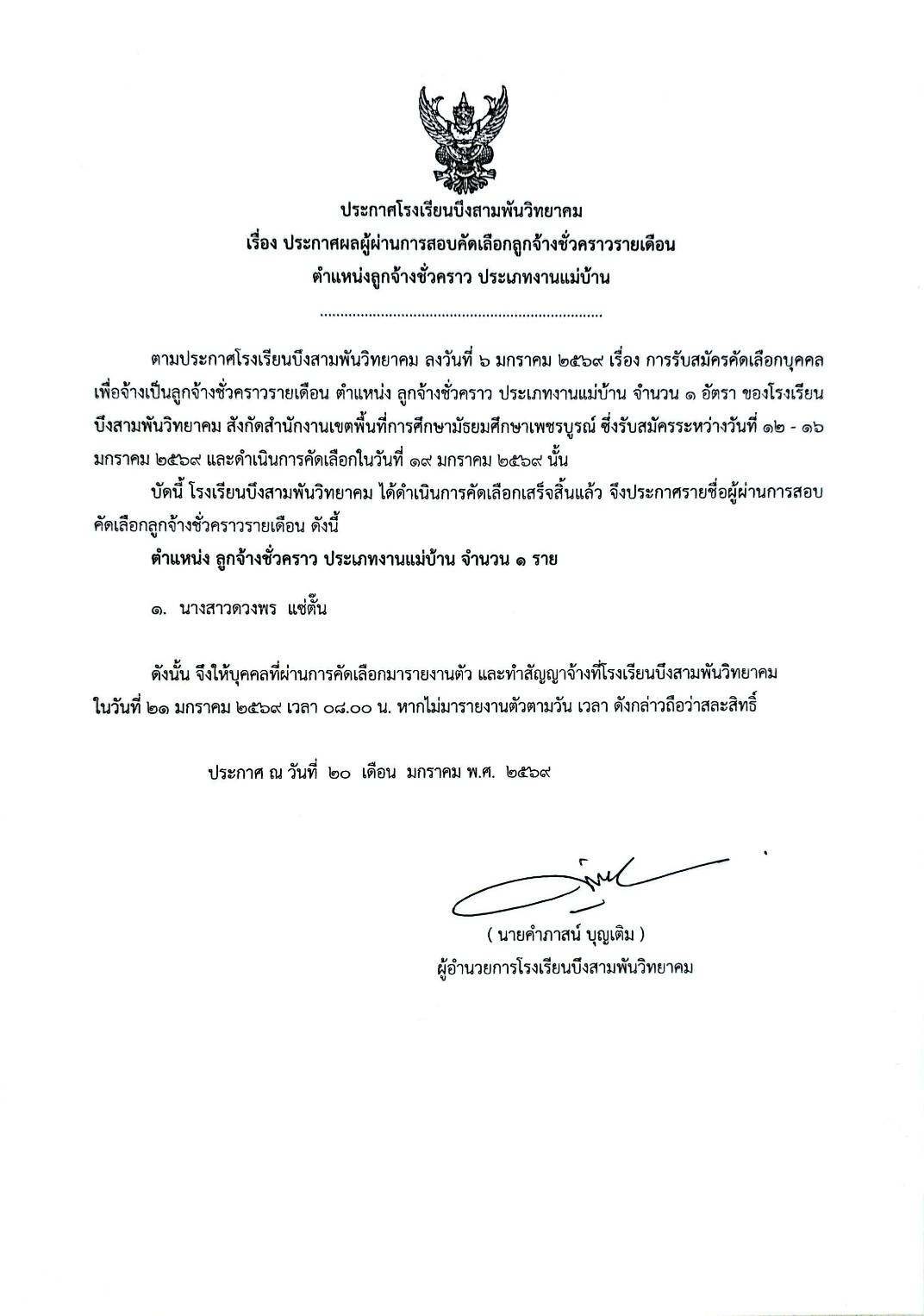 ตามประกาศโรงเรียนบึงสามพันวิทยาคม ลงวันที่ ๖ มกราคม ๒๕๖๙ เรื่อง การรับสมัครคัดเลือกบุคบุคลเพื่อจ้างเป็นลูกจ้างชั่วคราวรายเดือน ตำแหน่ง ลูกจ้างชั่วคราว ประเภทงานแม่บ้าน จำนวน ๑ อัตรา ของโรงเรียนบึงสามพันวิทยาคม สังกัดสำนักงานเขตพื้นที่การศึกษามัธยมศึกษาเพชรบูรณ์ ซึ่งรับสมัครระหว่างวันที่ ๑๒ - ๑๖ มกราคม ๒๕๖๙ และดำเนินการคัดเลือกในวันที่ ๑๙ มกราคม ๒๕๖๙ นั้น