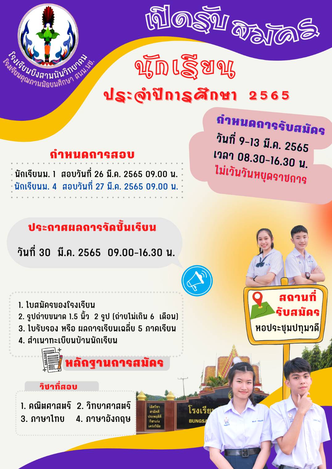 โรงเรียนบึงสามพันวิทยาคม เปิดรับสมัครนักเรียนเพื่อศึกษาต่อในระดับม.1 และ ม.4