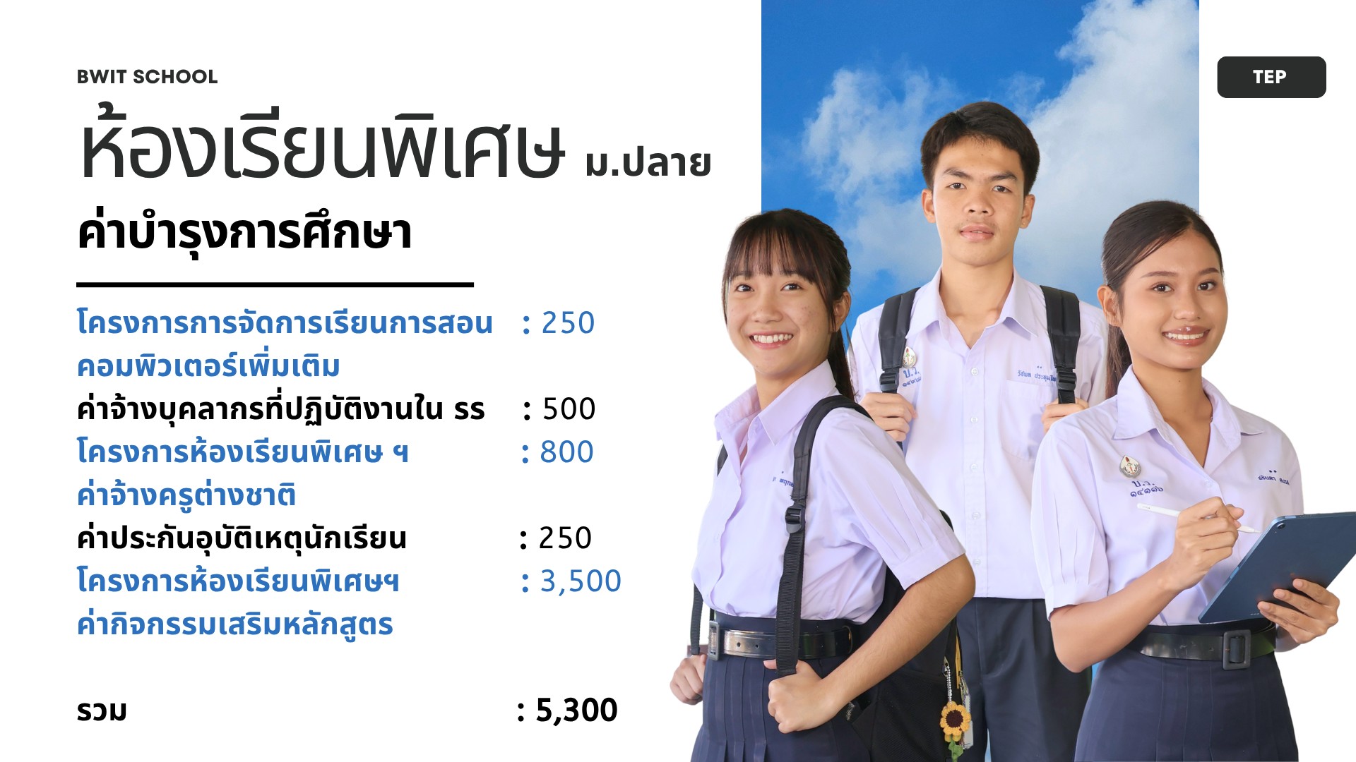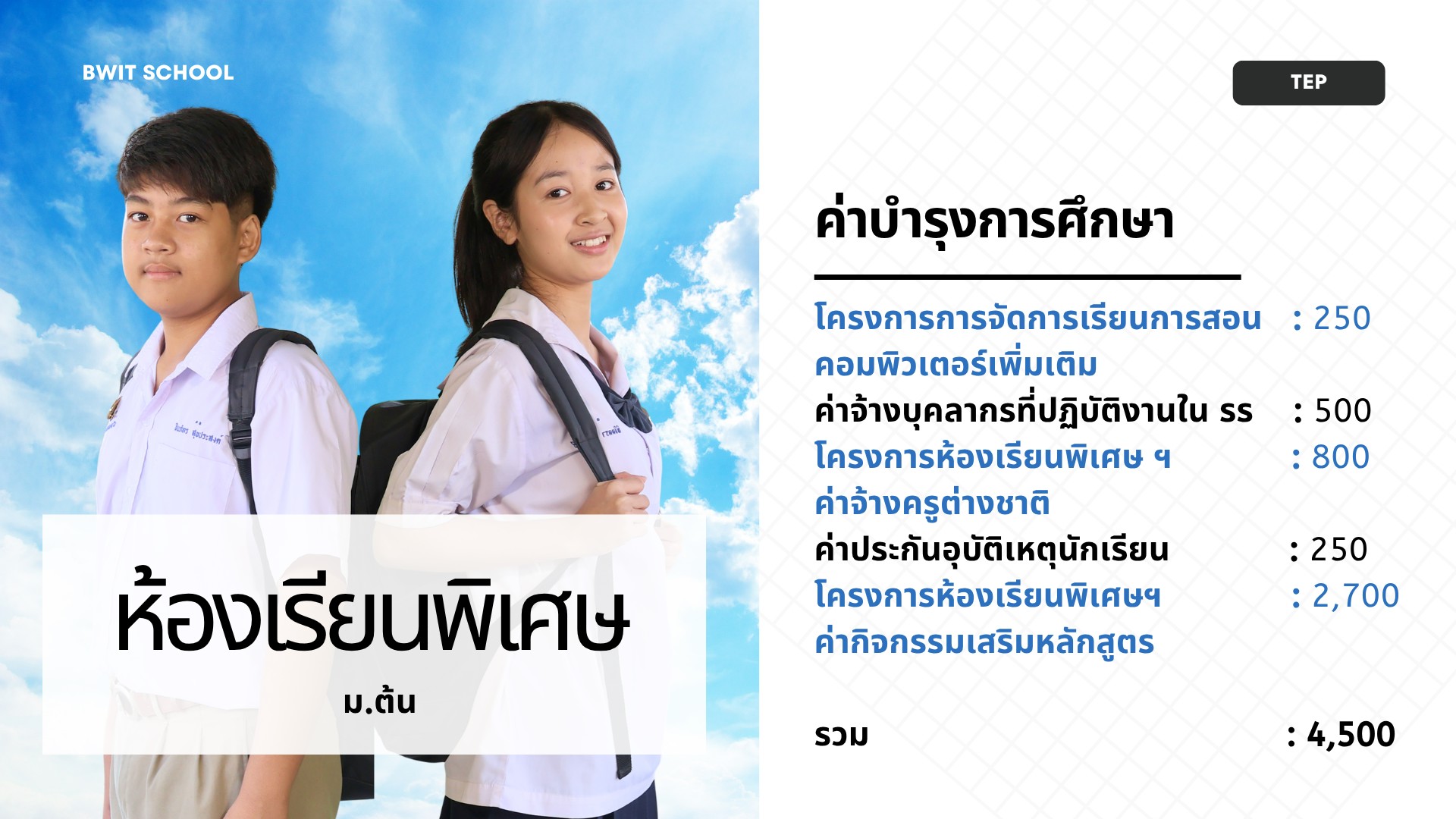 ประกาศเกี่ยวกับค่าใช้จ่ายของนักเรียนภาคเรียนที่ 1 ปีการศึกษา 2569 >> ห้องเรียนพิเศษ ม.ต้น รวม 4,500 บาท >> ห้องเรียนพิเศษ ม.ปลาย รวม 5,300 บาท