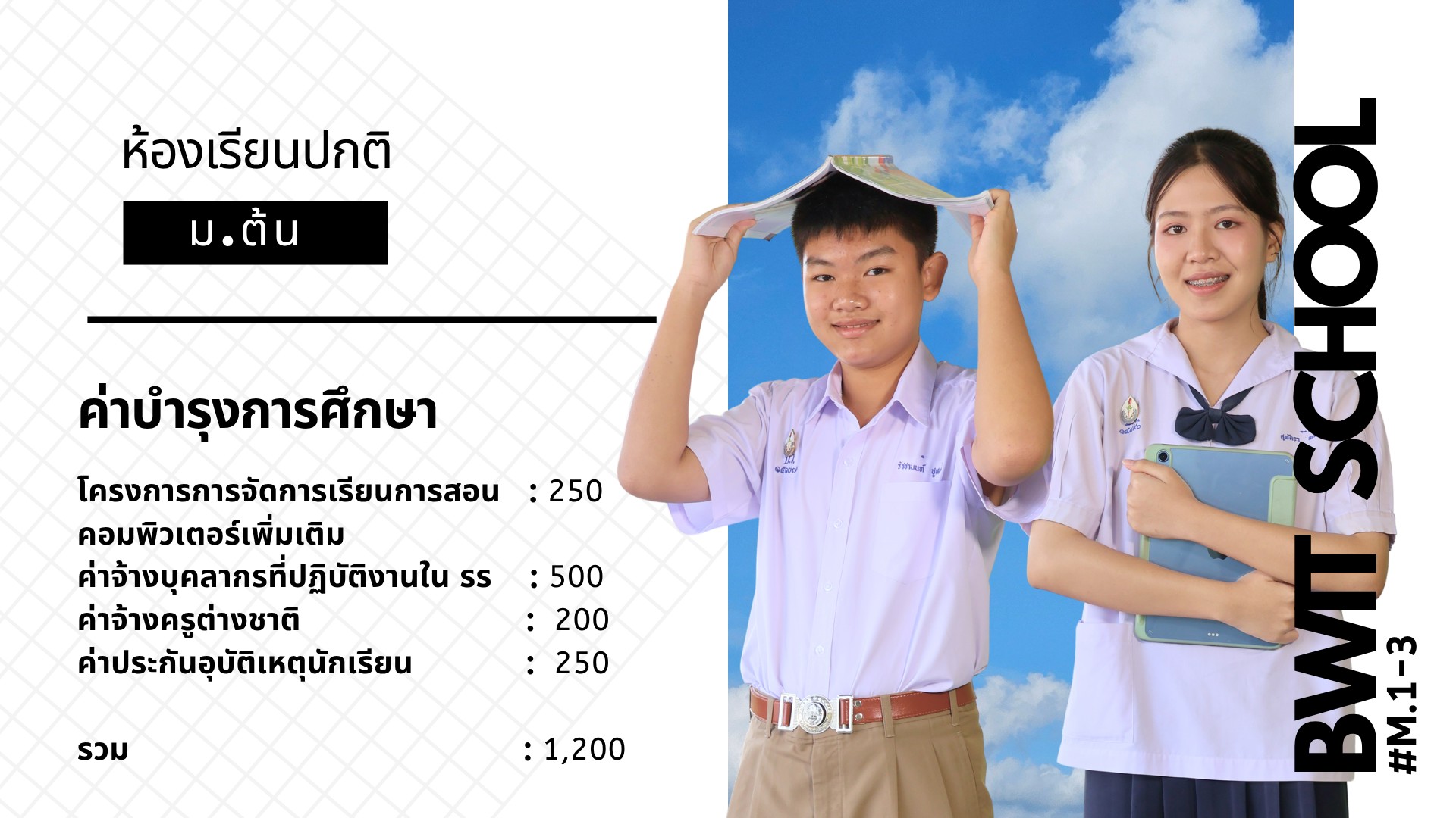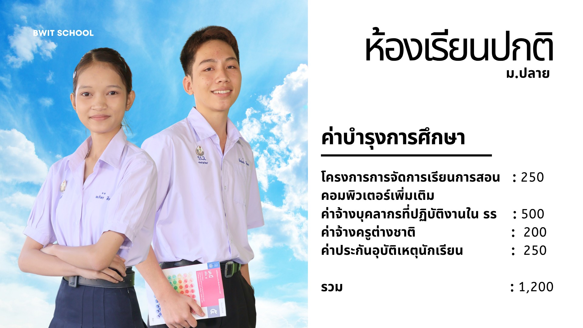 >> ห้องเรียนปกติ ม.ปลาย รวม 1,200 บาท >> ห้องเรียนปกติ ม.ต้น รวม 1,200 บาท >> กระเป๋าและชุดพละ ม.ต้น และ ม.ปลาย