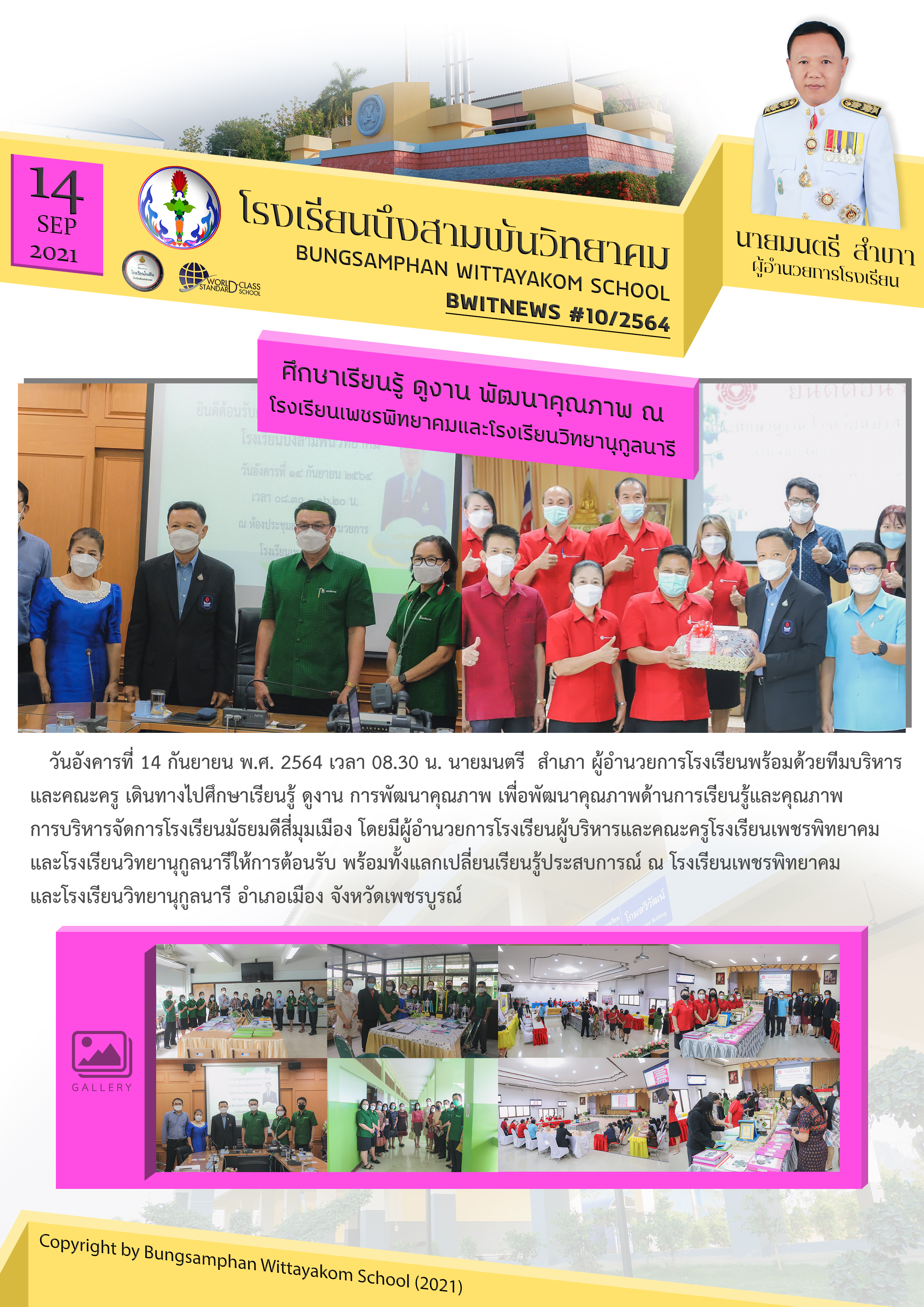 วันอังคารที่ 14 กันยายน พ.ศ.2564 นายมนตรี สำเภา ผู้อำนวยการโรงเรียนพร้อมด้วยทีมบริหารและคณะครู เดินทางไปศึกษาเรียนรู้ ดูงาน การพัฒนาคุณภาพ เพื่อพัฒนาคุณภาพด้านการเรียนรู้และคุณภาพการบริหารจัดการโรงเรียนมัธยมดีสี่มุมเมือง