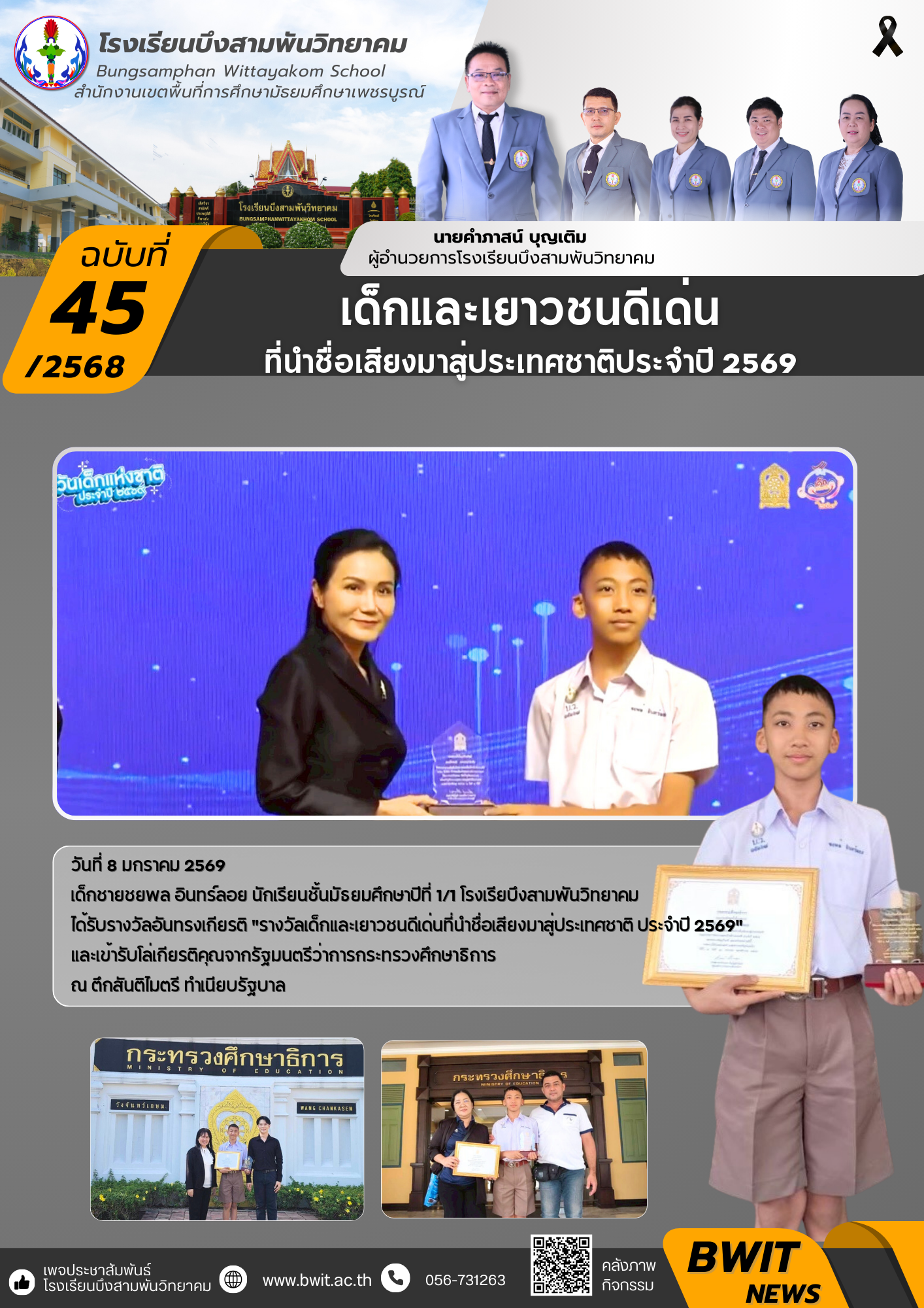 วันที่ 8 มกราคม 2569 เด็กชายชยพล อินทร์ลอย นักเรียนชั้นมัธยมศึกษาปีที่ 1/1 โรงเรียบึงสามพันวิทยาคม ได้รับรางวัลอันทรงเกียรติ "รางวัลเด็กและเยาวชนดีเด่นที่นำชื่อเสียงมาสู่ประเทศชาติ ประจำปี 2569"และเข้ารับโล่เกียรติคุณจากรัฐมนตรีว่าการกระทรวงศึกษาธิการ ณ ตึกสันติไมตรี ทำเนียบรัฐบาล กรุงเทพมหานคร