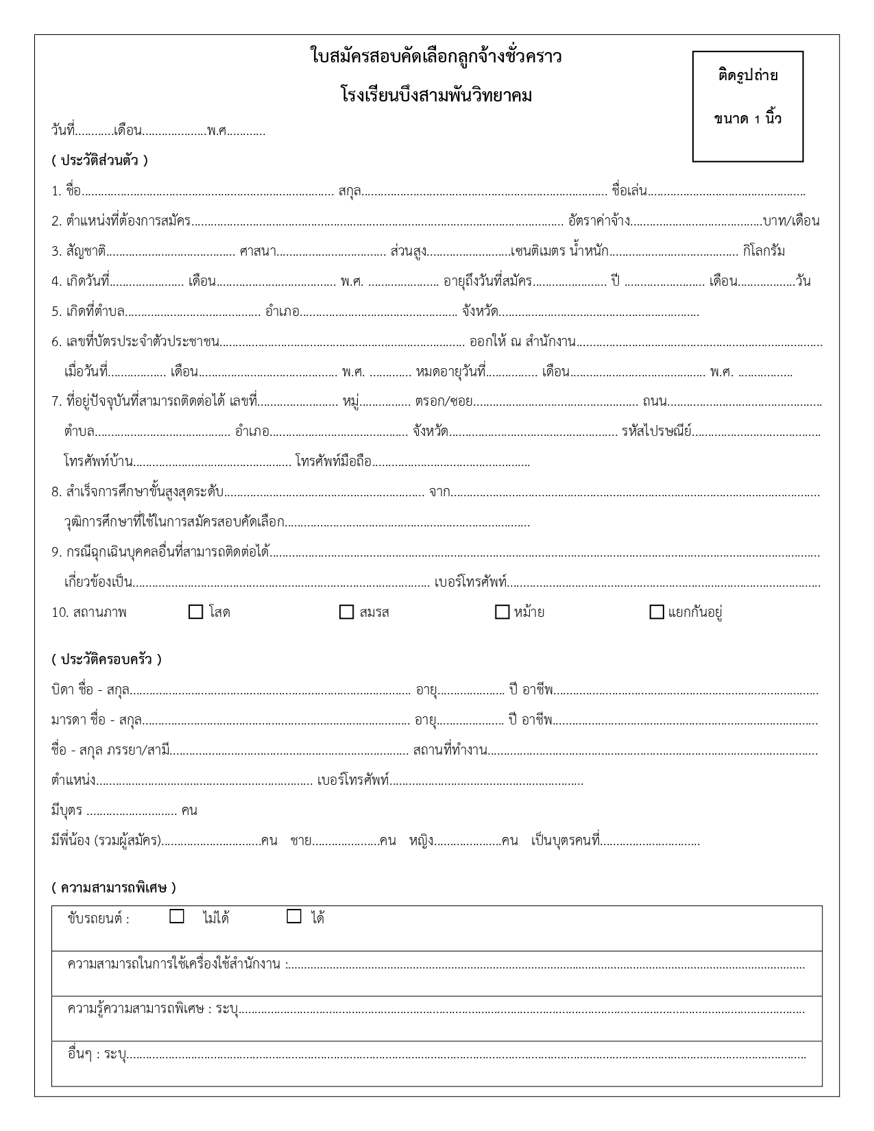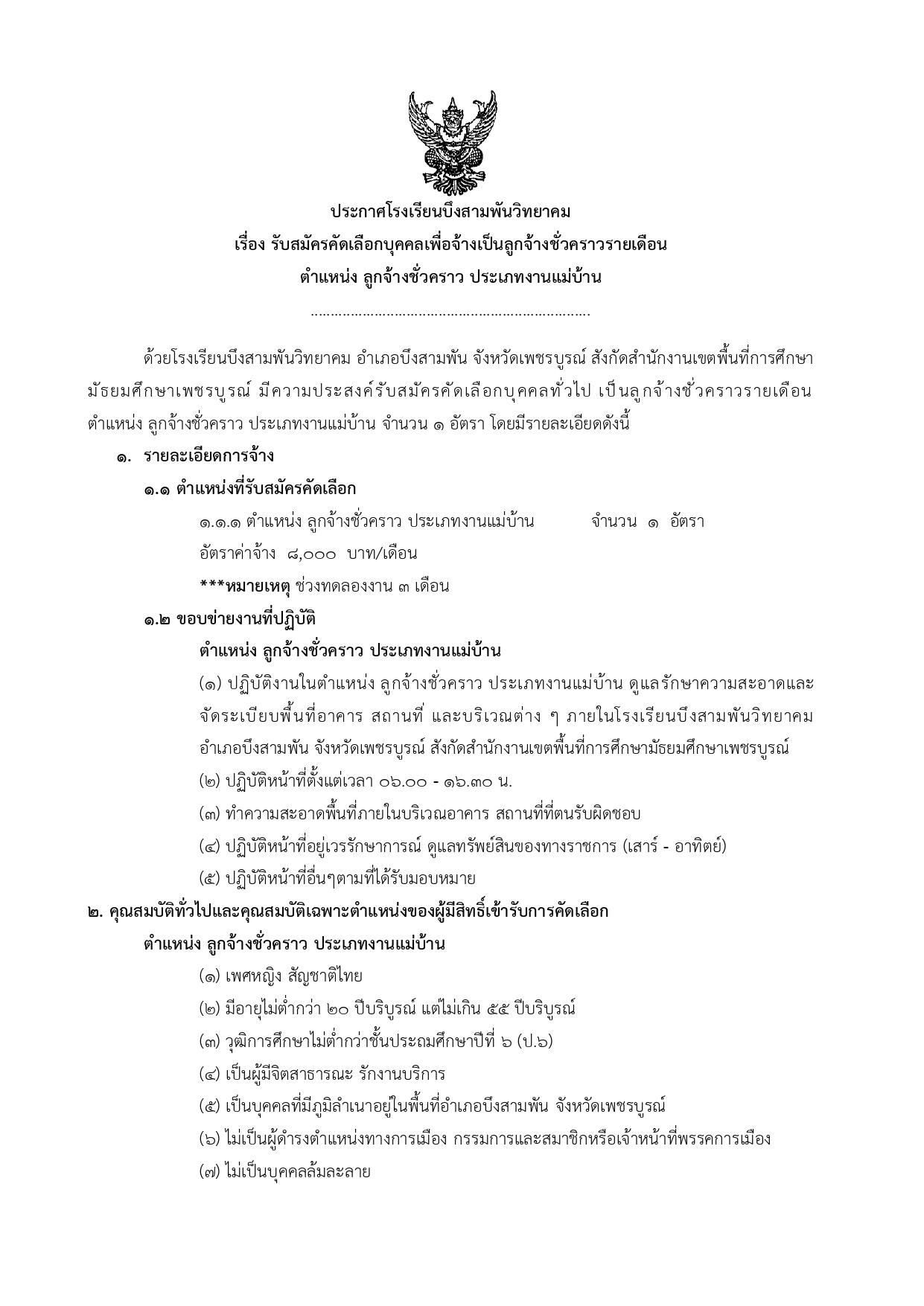 ด้วยโรงเรียนบึงสามพันวิทยาคม อำเภอบึงสามพัน จังหวัดเพชรบูรณ์ สังกัดสำนักงานเขตพื้นที่การศึกษามัธยมศึกษาเพชรบูรณ์ มีความประสงค์รับสมัครคัดเลือกบุคคลทั่วไป เป็นลูกจ้างชั่วคราวรายเดือน ตำแหน่ง ลูกจ้างชั่วคราว ประเภทงานแม่บ้าน จำนวน ๑ อัตรา โดยมีรายละเอียดดังแนบมาด้านล่าง หรือ คลิกที่นี่!!